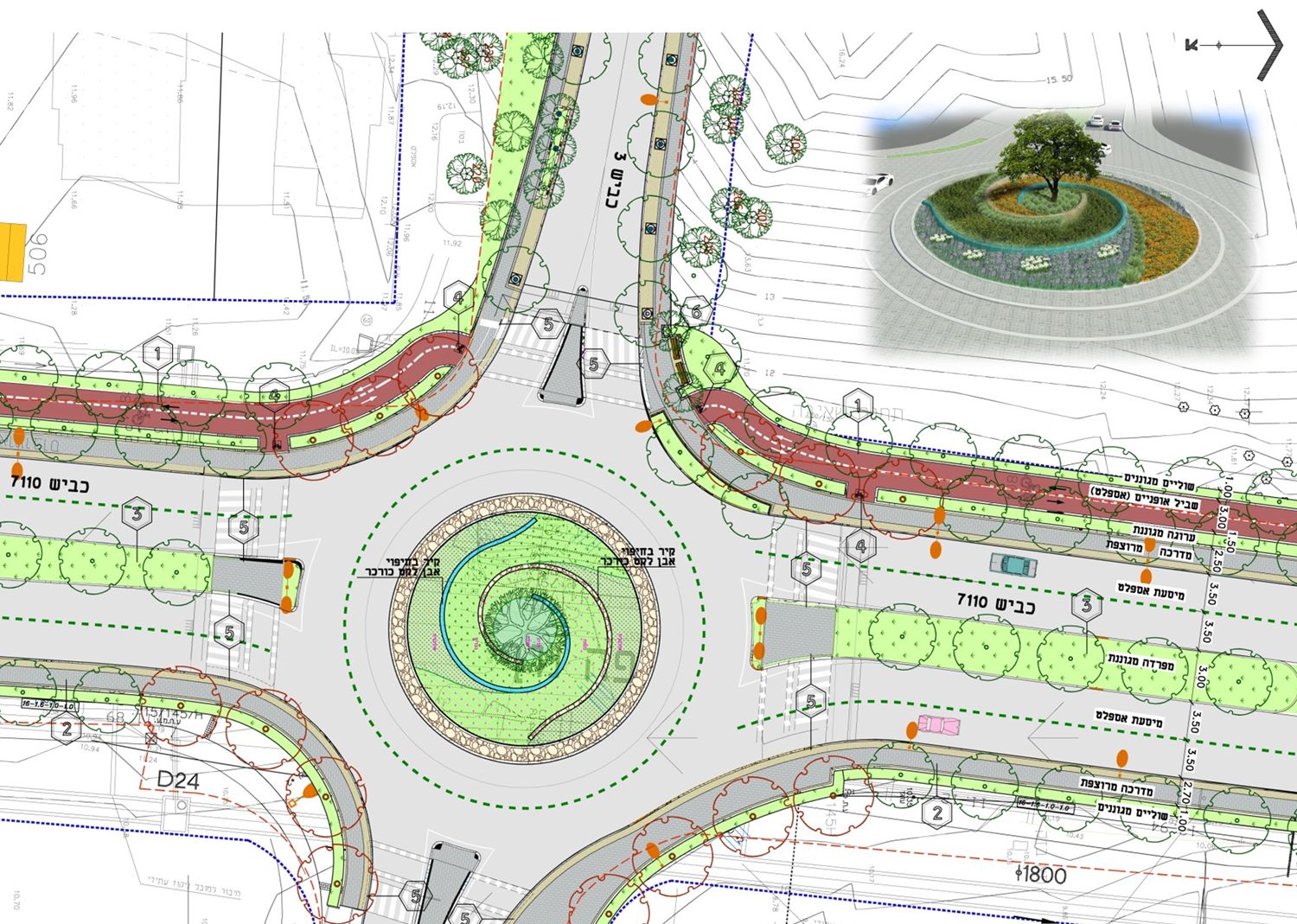 הכביש תוכנן כשדרה עם מדרכות מוצלות ושביל אופניים דו סטרי ורחבות שהייה משותפות להולכים ולרוכבים הצופות לנוף הרכסים ממערב וממזרח- רכס הכורכר ורכס הכרמל. העצירה לצד הדרך, השהייה והצפייה בנוף הסובב מחזקות את תחושת הזהות של האנשים. השדרה היא שדרת עצי דולב שבהם משולבים גם עצים פורחים משני צידי הכביש, בשוליים שורת עצים נוספת המייצגת את עצי הרכס המקומיים – חרובים, זיתים, ברושים. באזור נחל אורן, שחוצה את הכביש במעביר תחתי, תוכננה צמחייה אופיינית לנחלים. הכביש גם מקושר לשמורת חרבת קרתא באזור הכניסה לעתלית.